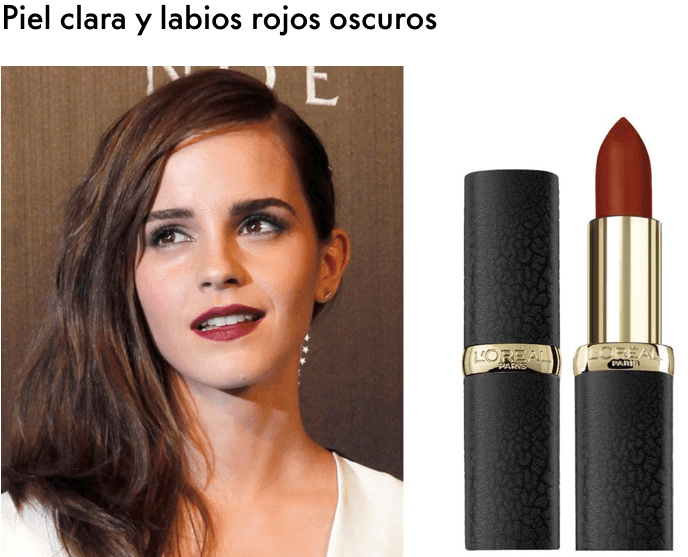 Para escapar del clásico rojo, apuesta por un rojo con matices marrones, al estilo de Emma Watson. Ideal para ojos oscuros como ella. En cambio, si son claros, apuesta por un tono más rosado. Para evitar que el labial te haga parecer demasiado pálida. En la imagen, la barra de labios ‘Color Riche Mate’ en el tono 348 Brick Vintage, de L’Óreal Paris.