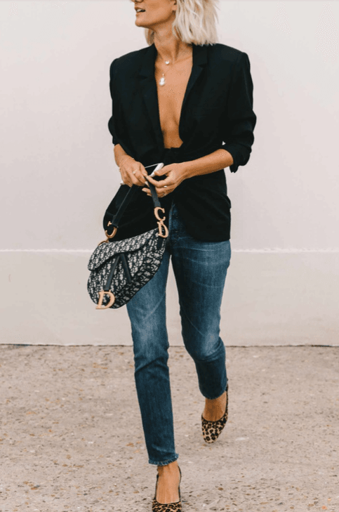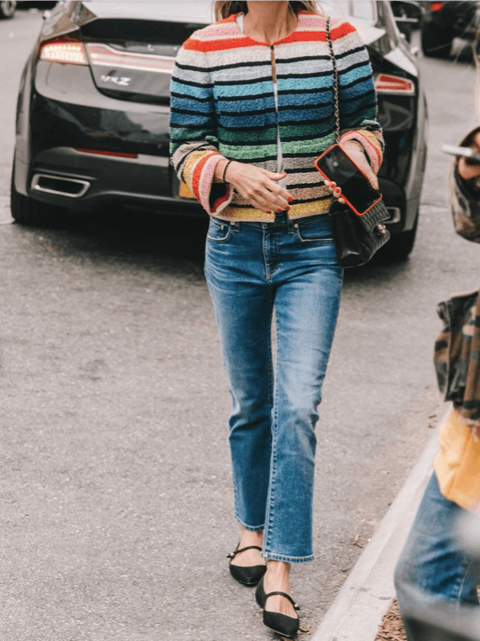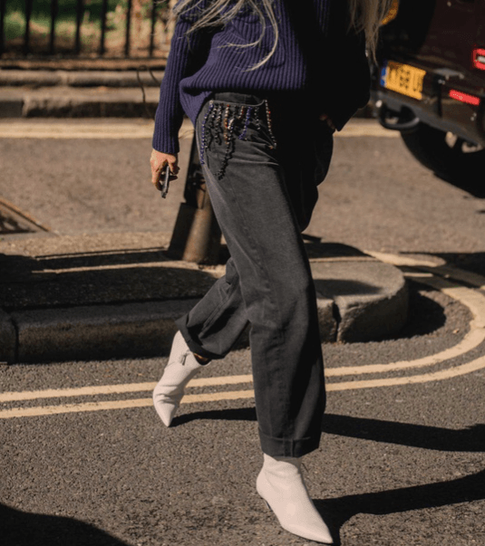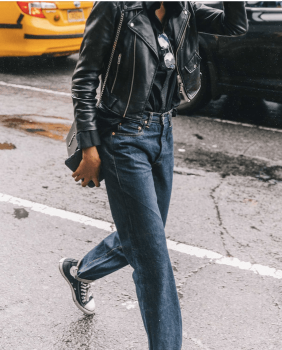 Tus jeans son… de tiro medio con detalles en los bolsillos y laterales.Aunque los de cintura alta también consiguen este efecto, colocar el inicio del pantalón sobre ellas centra ahí la atención. Pero esta imagen contiene el segundo truco, y es el de adornar la parte exterior de los bolsillos con cualquier aderezo que actúe como imán visual. Y sí, recoger el buzo también funciona.